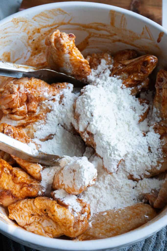 - Season the wings with SPG and a BBQ rub then pour in the corn starch and mix thoroughly.