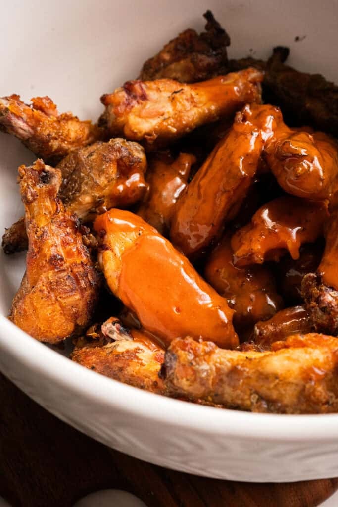 Place the cooked wings in a large bowl, drizzle in the buffalo sauce, and toss until evenly coated.