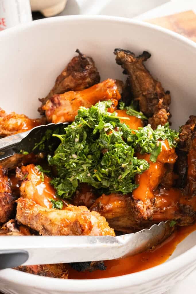 - Place the finished wings in a large bowl then drizzle in the buffalo sauce and top them with chimichurri.
