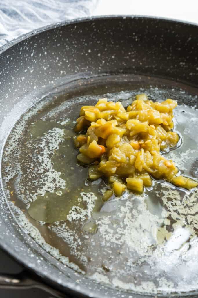 Make the homemade queso by melting butter in a saucepan then add the can of green chilies and cook for 2-3 minutes.