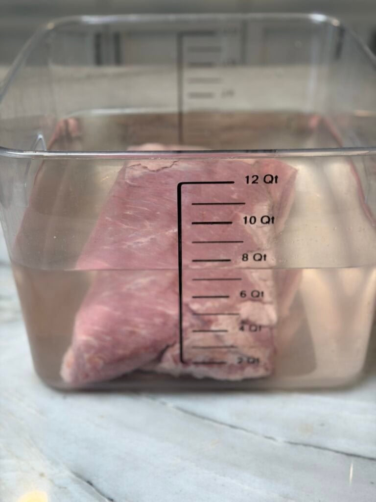 Start by removing the seasoned corned beef from the packaging. Place it in cold water and refrigerate it for 2–6 hours.