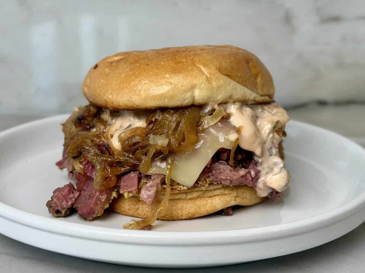 Each bite delivers smoky meat, sweet onions, tangy dressing, and creamy melted cheese. The balance of textures and flavors makes this one of the most satisfying sandwiches you can make at home.