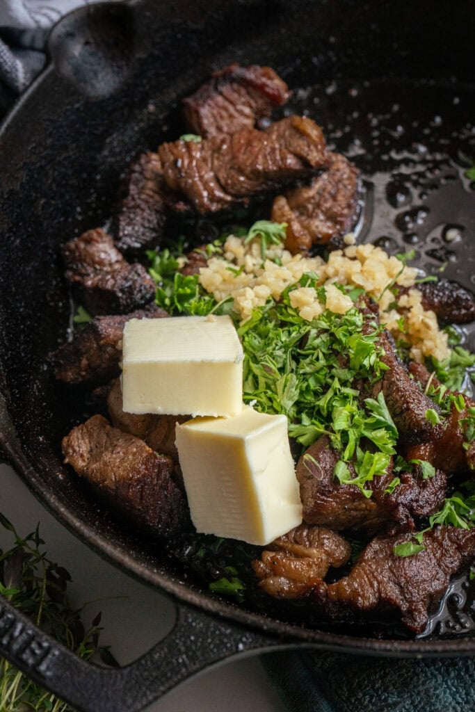 - Cook the steak bites over high heat in a skillet stirring every couple of minutes. Once browned on all sides, add 2 tbsp butter, 3 cloves minced garlic, 1 tbsp fresh thyme, 1 tbsp fresh parsley then mix until fully coated.