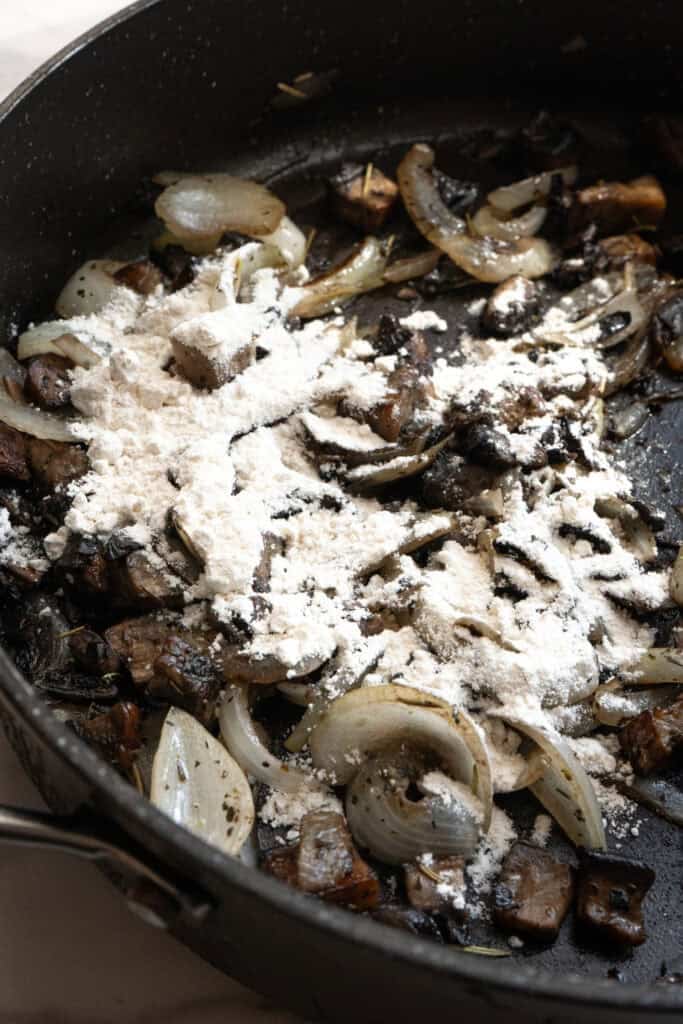 Next, season with SPG, rosemary, and thyme, then sprinkle in 1 tablespoon of flour. Stir for 3–4 minutes to form a light roux, which will help thicken the sauce.