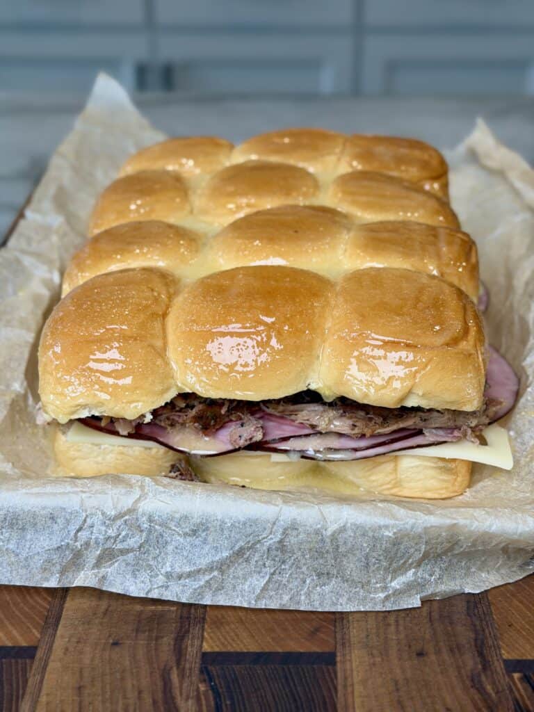 As they bake, the Swiss cheese will melt into the layers of pork, ham, and salami while the tops of the rolls turn beautifully golden brown.