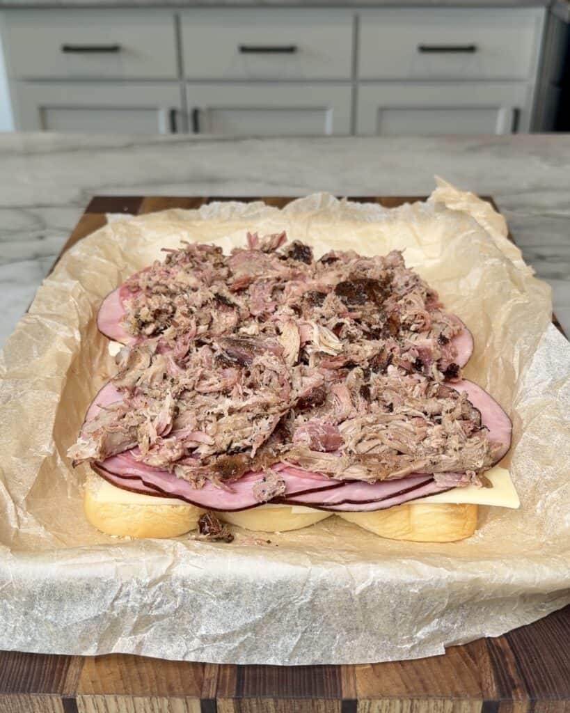 - Assemble the sliders on a sheet tray by placing the following on the bottom buns: 4 slices of swiss cheese, ham, salami, pulled pork, 4 slices of swiss cheese and pickles.