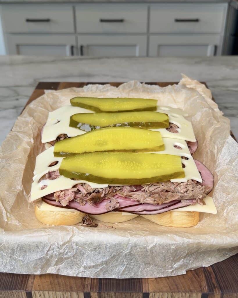 Top the pork with the remaining four slices of Swiss cheese and the dill pickle slices. These pickles add the signature tangy bite that makes a classic Cuban sandwich so delicious.