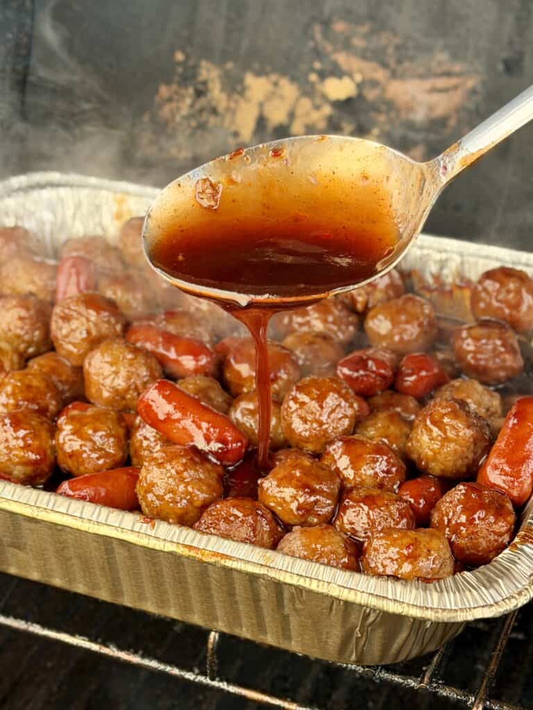 After 45 minutes, stir the mixture well, basting the meatballs and sausages with the sauce pooled at the bottom of the pan. Return it to the smoker for another 15 minutes, allowing the sauce to thicken and cling to the meat.