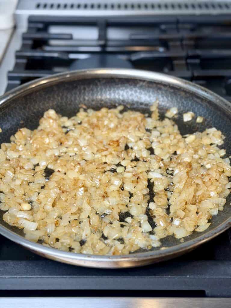 Add the diced white onion and cook for 10–15 minutes until soft and developing a deep caramelized onion flavor.