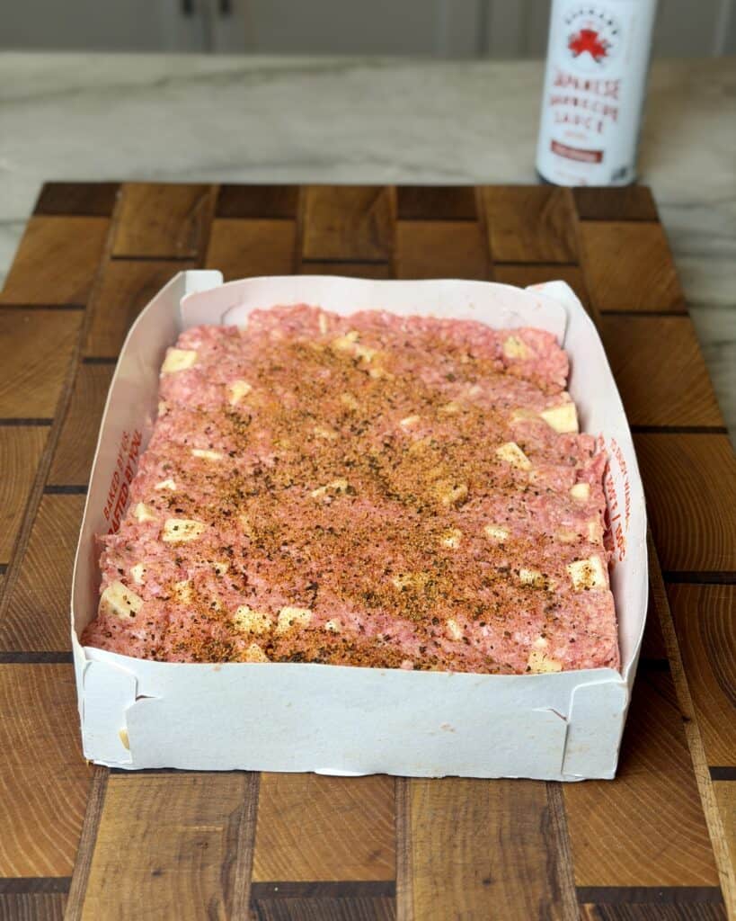 - Stuff the burger mixture into the hawaiian rolls container making sure it’s evenly distributed.