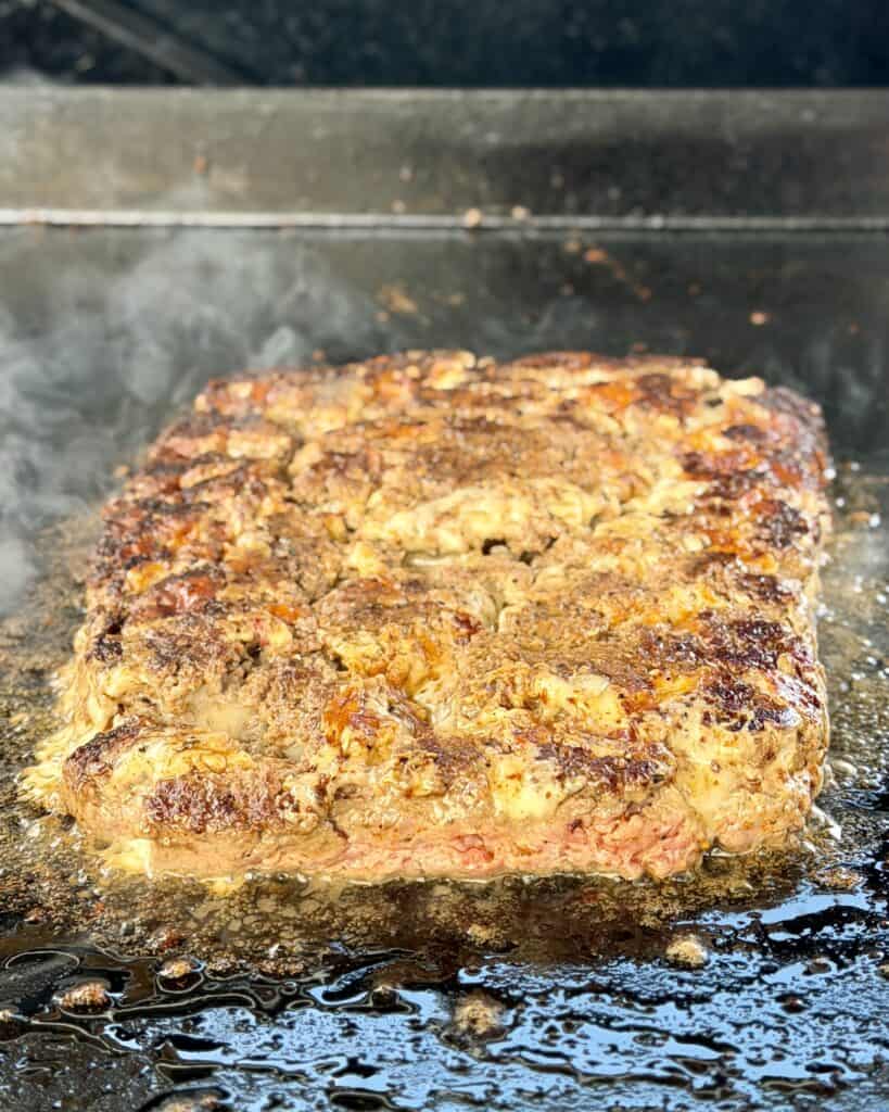 Meanwhile, toast the slider buns on the griddle over medium heat until golden brown. I also recommend toasting the bottom of the bottom half of the rolls. This helps keep the bottom of the sliders from becoming too soft.