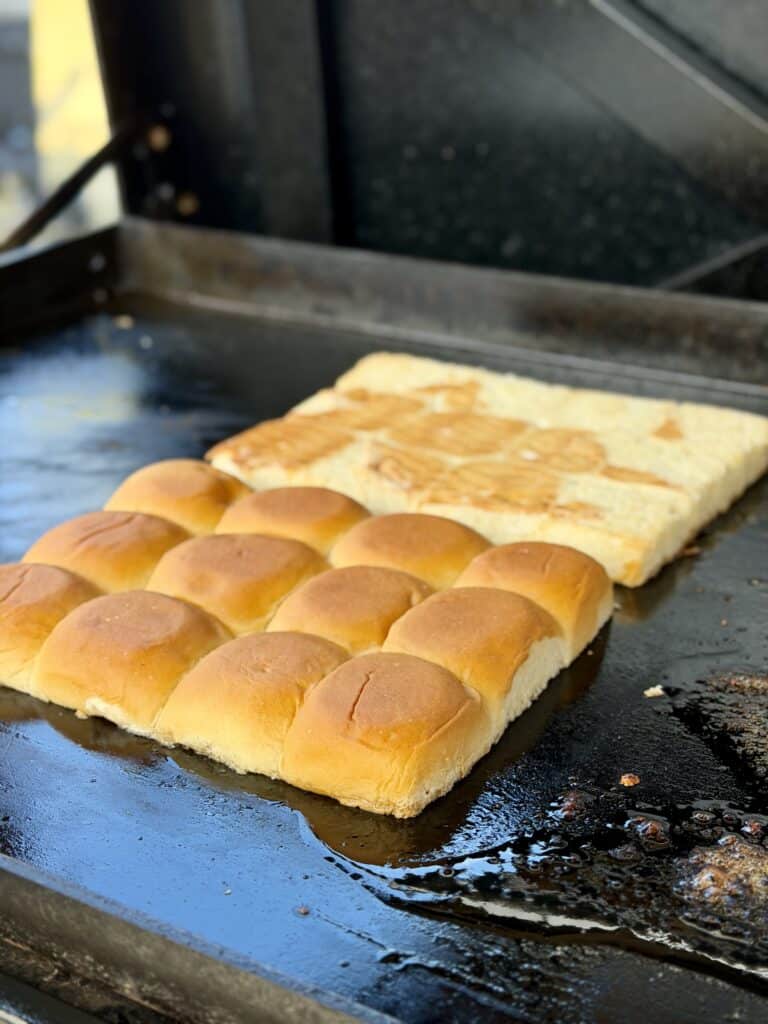 - Toast the slider rolls on the griddle over medium heat until golden brown.