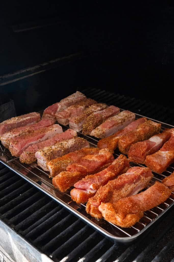 Preheat your smoker to 250°F. Place the seasoned pork belly slices directly on the smoker grates or keep them on the wire rack for easy handling.