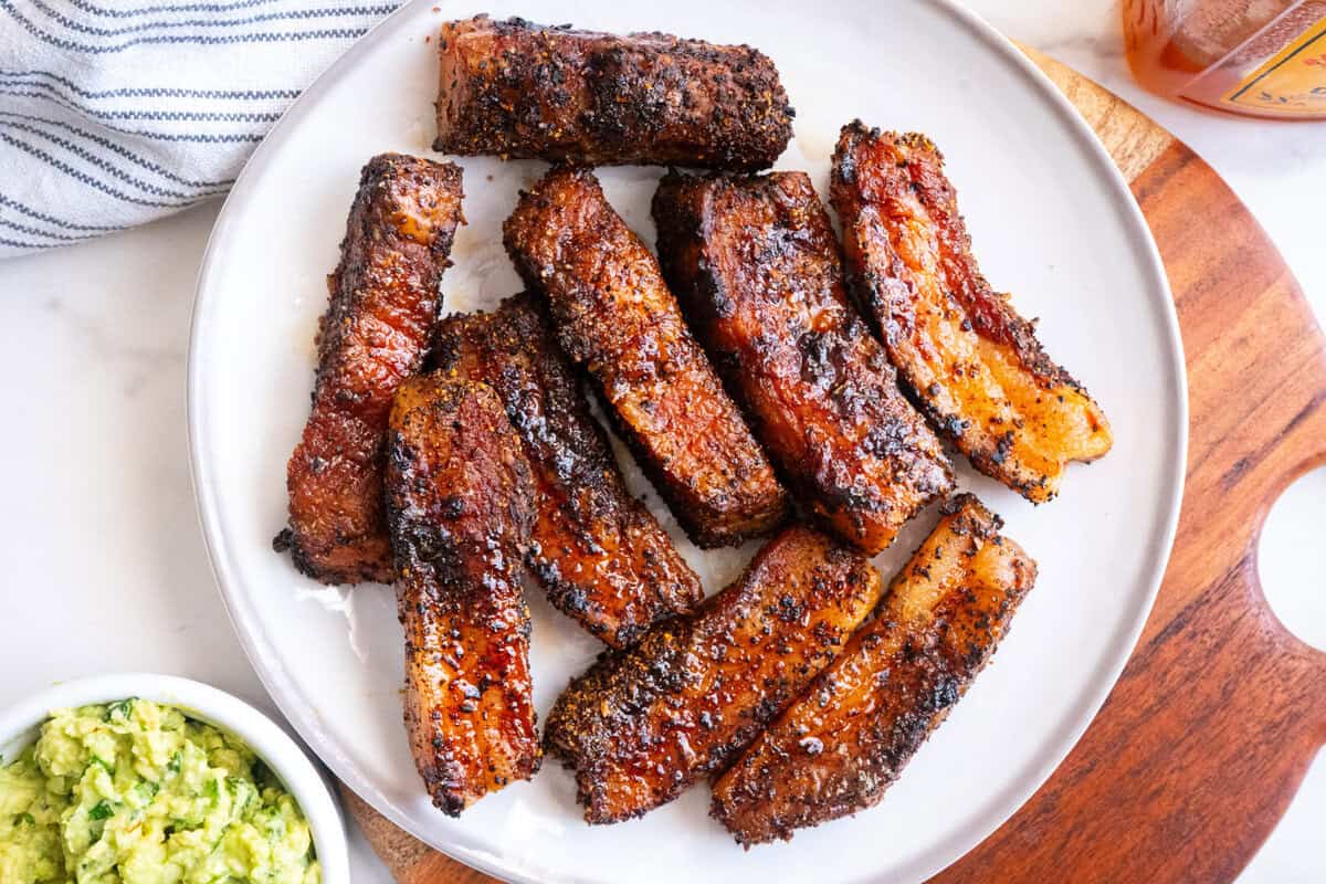 Once the pork belly reaches 185°F, transfer it to an air fryer preheated to 400°F. Cook for 3–4 minutes per side, flipping once, until the edges are deeply golden brown and crispy.