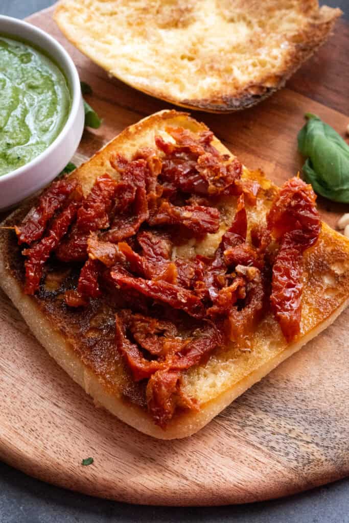 The result should be a thick, smooth, and fragrant green sauce. Transfer your pesto to a small bowl and set it aside. You’ll use this to spread pesto on your toasted ciabatta later.