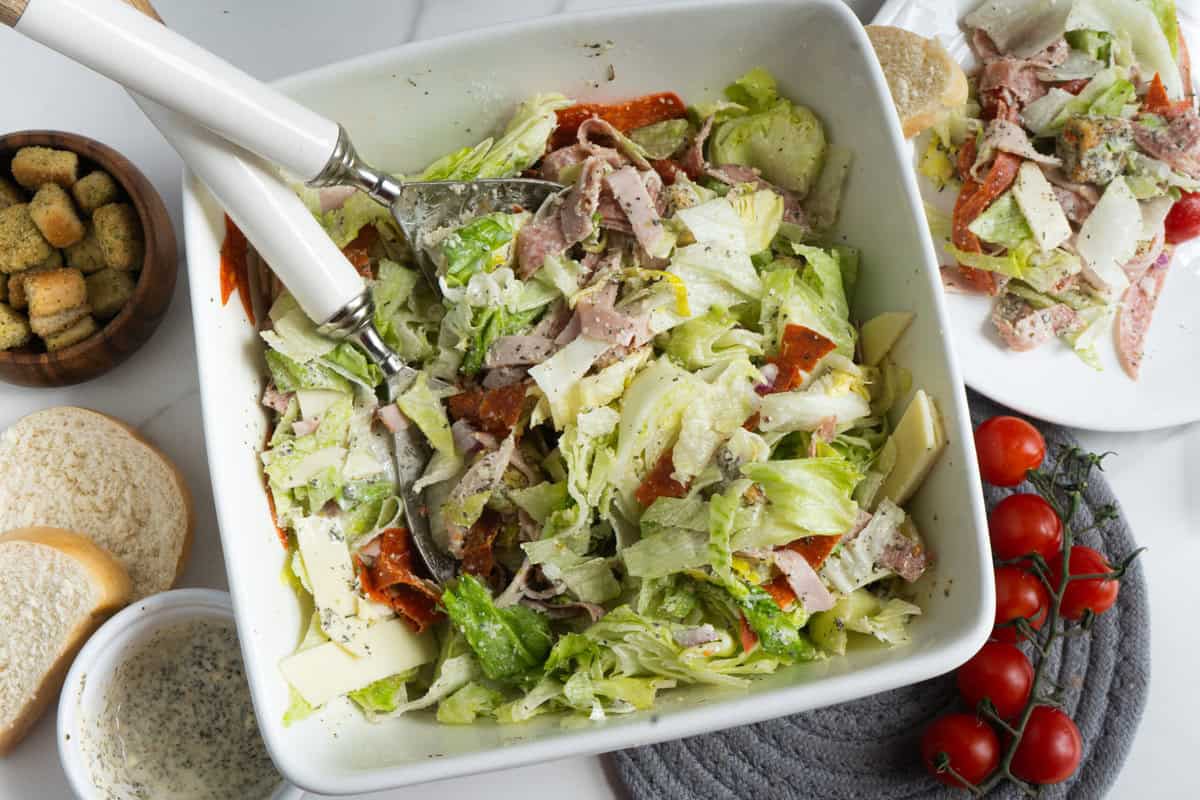 Packed with salad ingredients like crunchy lettuce, briny pepperoncini peppers, juicy grape tomatoes, and layers of cold cuts, this dish proves that a salad recipe can be just as indulgent and filling as your favorite sub.