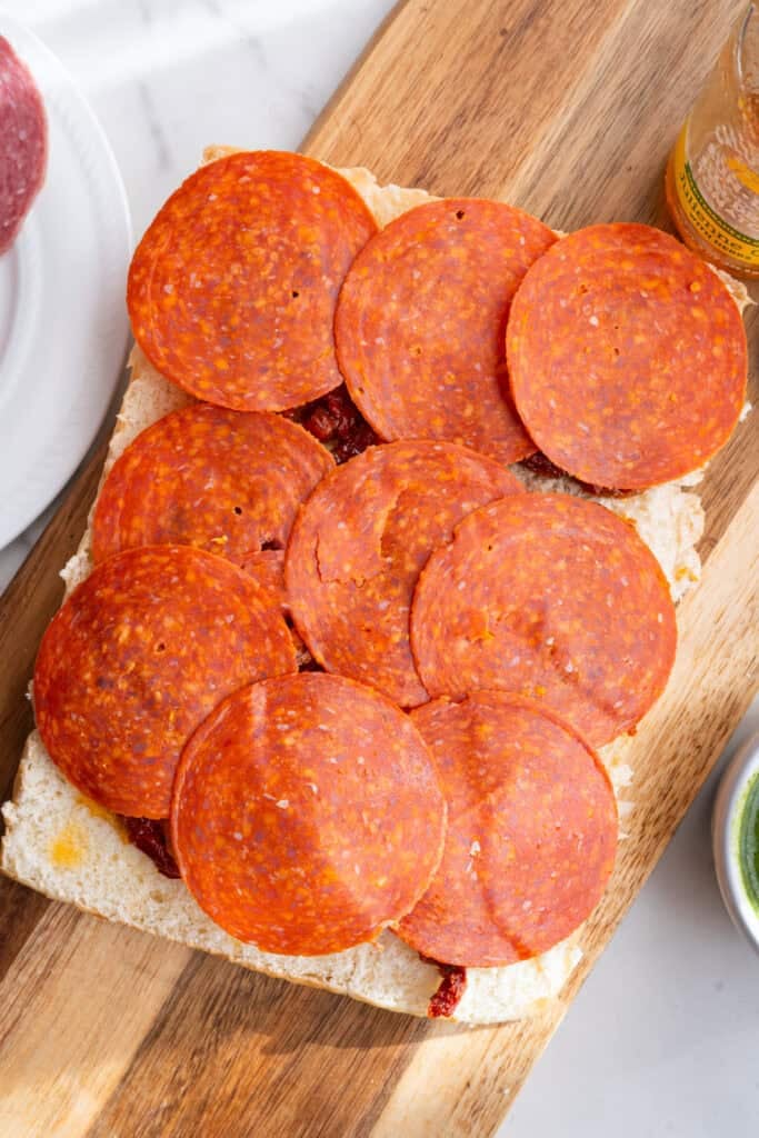 - Layer meat and cheese: sun dried tomatoes, pepper jack cheese, salami, ham, pepperoni and provolone cheese