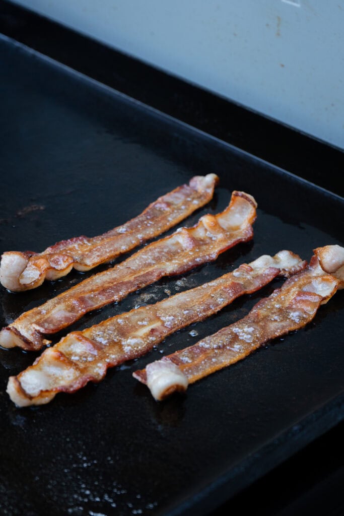 - Add thick cut bacon to a hot griddle. Cook until crispy then remove and set aside.