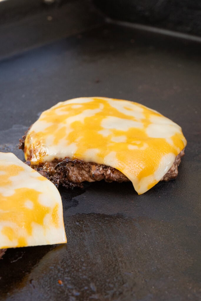 - Add the burger patties to the hot griddle and let them cook for 4-5 minutes each side then add pepperjack cheese and let it melt.