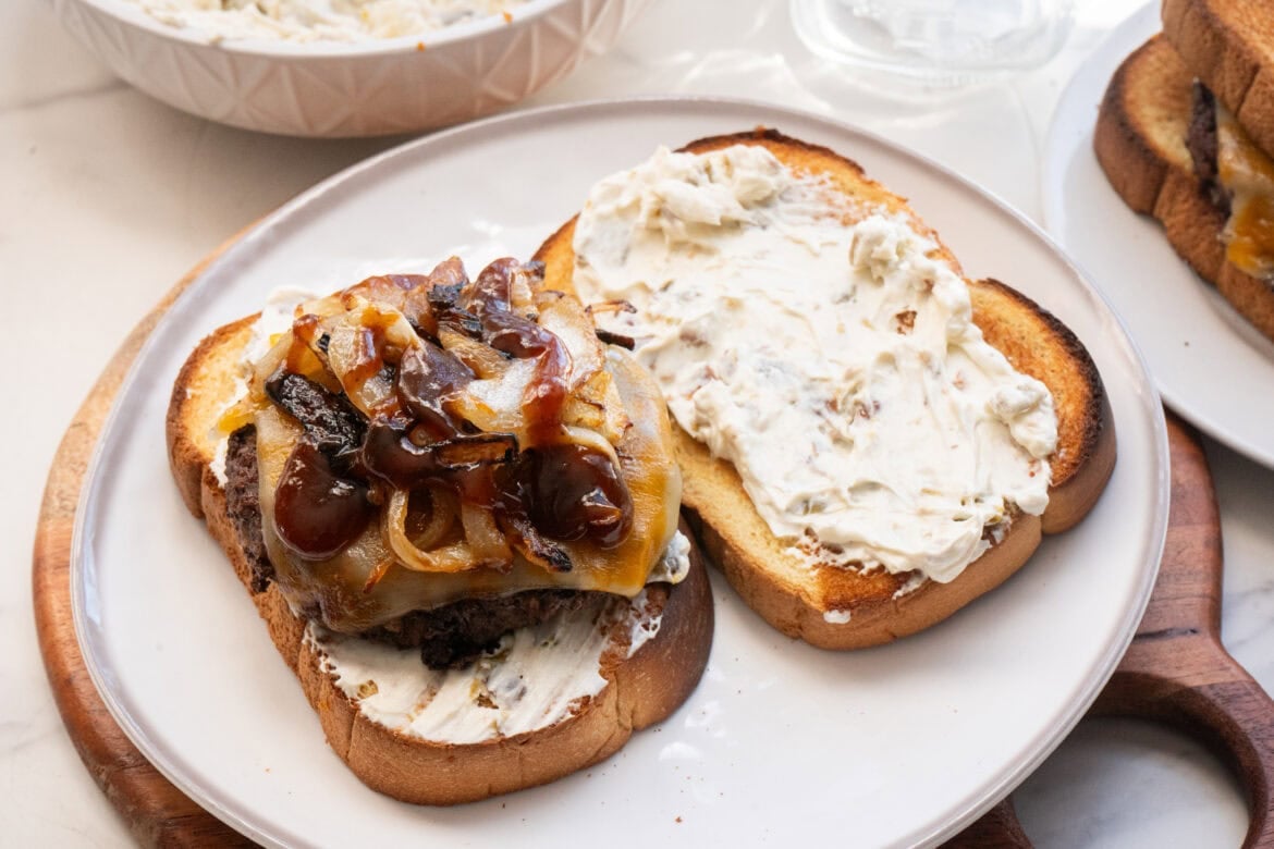 Spread a generous layer of the cream cheese mixture on the toasted bread. Add the cheesy burger patty, caramelized onions, and a drizzle of BBQ sauce. Top with the second slice of bread, slice in half, and dig in.
