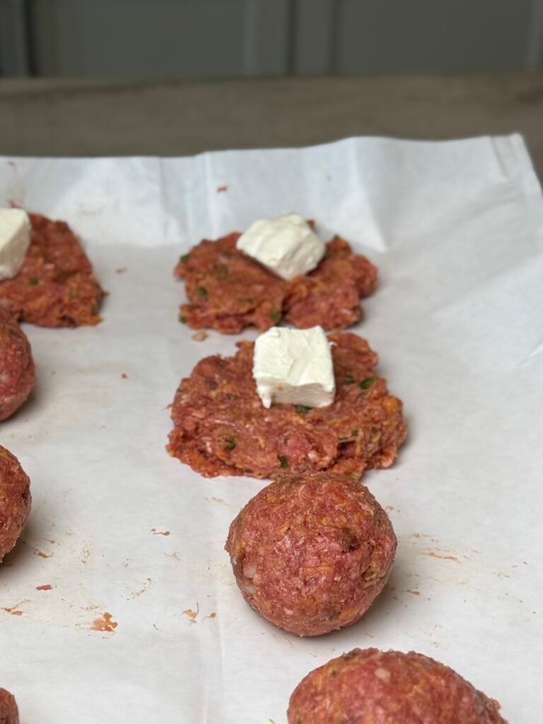 - Stuff 1/12th of a partially frozen cream cheese block in the meat then enclose and secure it by rolling it in your hands.