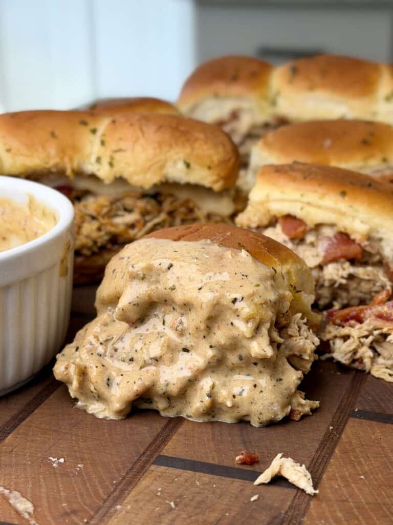 - Assemble the sliders on toasted rolls with pepper jack cheese, shredded chicken, Marry me sauce and mozzarella cheese.