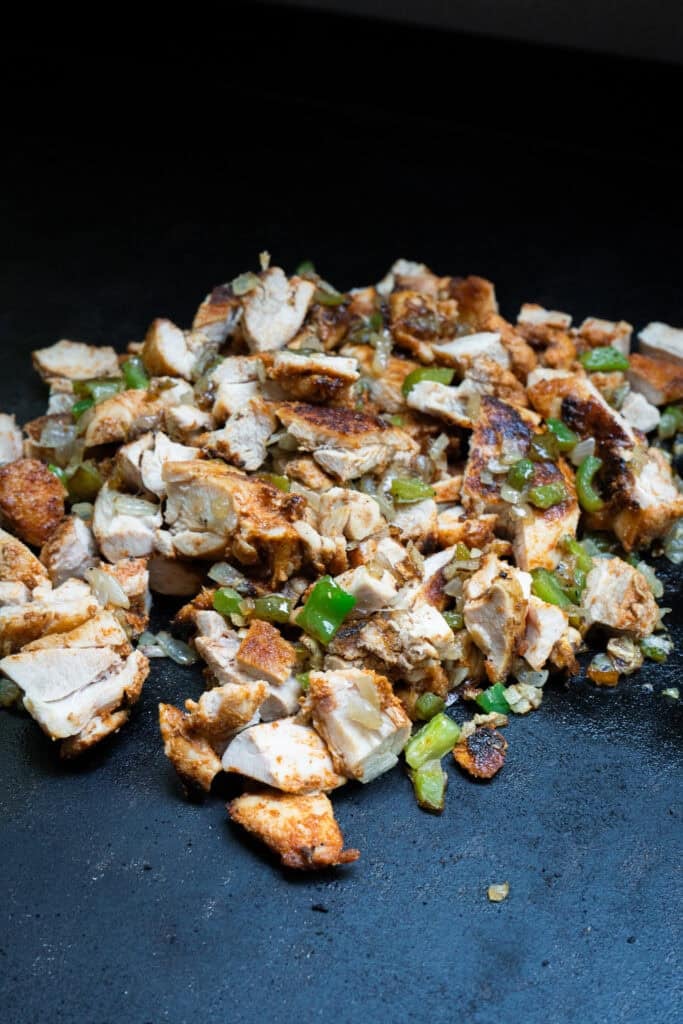 Return the chopped top chicken to the griddle with the peppers and onions.