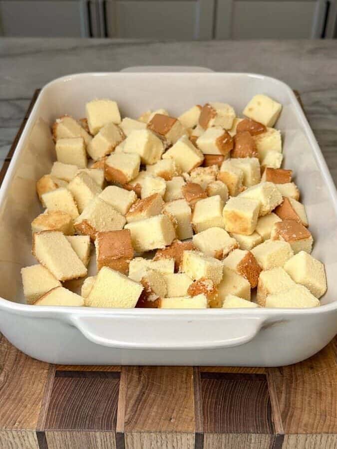 Place the cubed pound cake into a 9×13 dish, spreading it out evenly across the bottom. This layer acts as the soft, buttery foundation of the dessert.