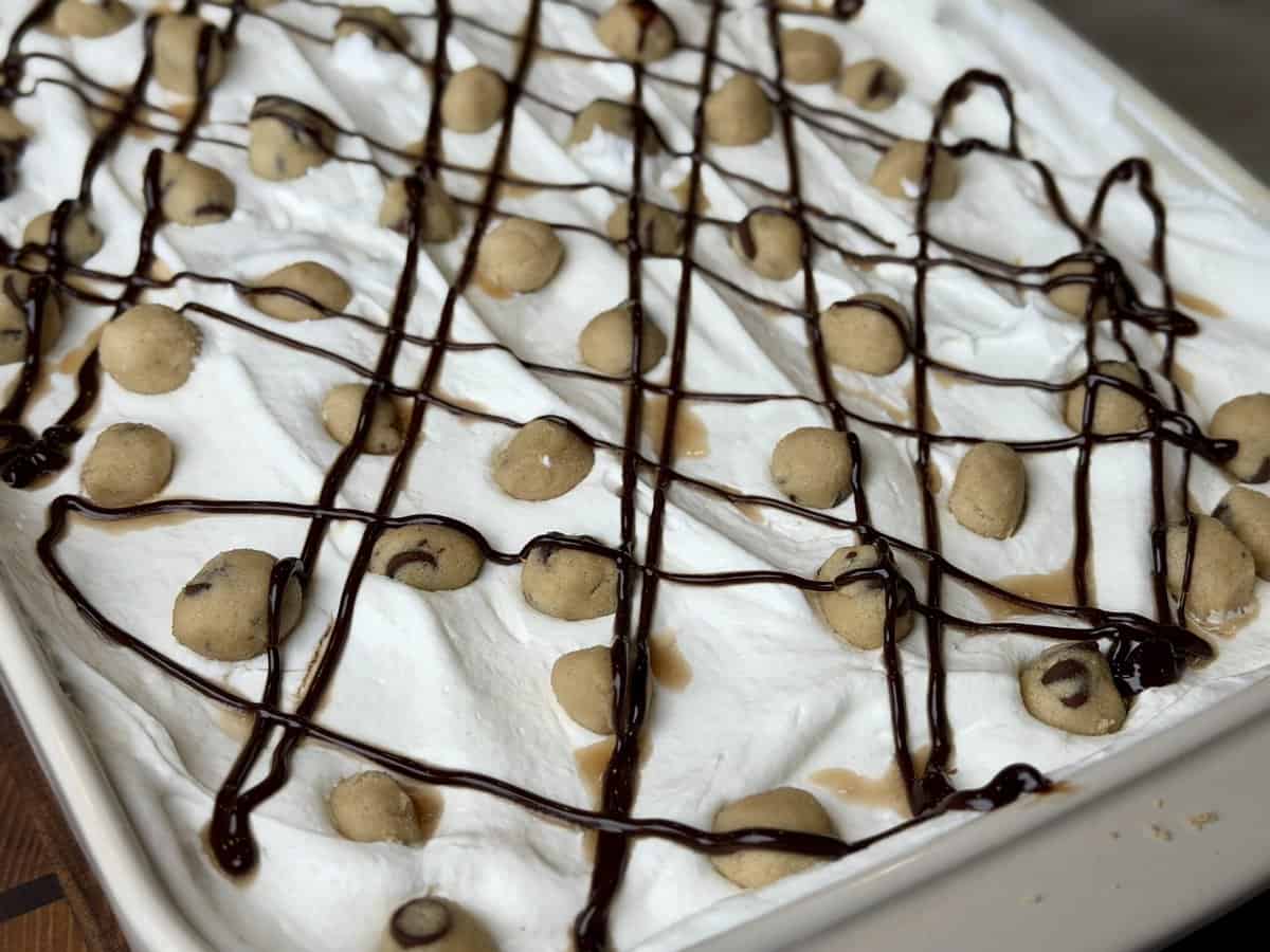 Roll small balls of cookie dough with your hands and place them across the top of the dessert. These little bites of cookie dough take this dessert to the next level.