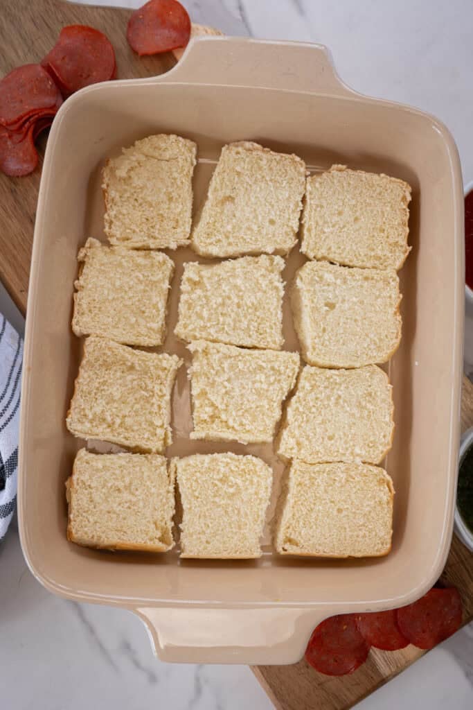 Carefully slice the soft Hawaiian rolls in half horizontally. Place the bottom half into a foil pan or baking dish—both work great for keeping everything together while baking.