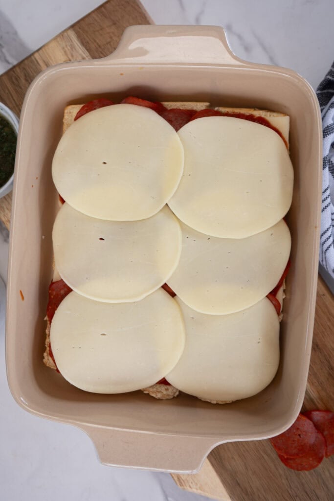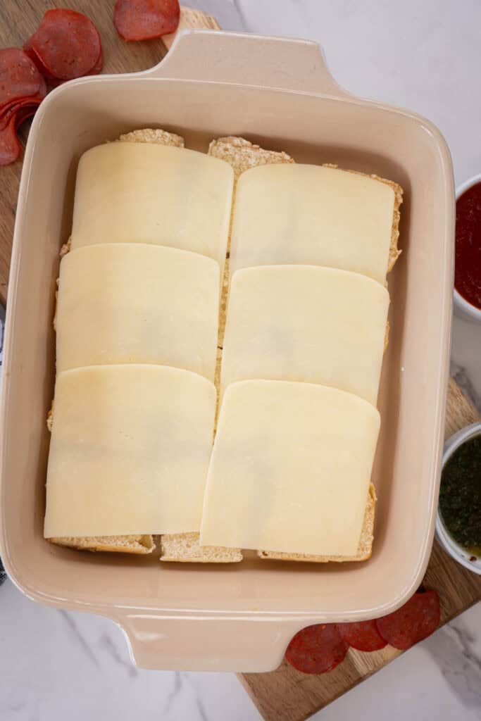 Begin by laying down all six slices of mozzarella cheese on the bottom half of the rolls. Mozzarella melts into that signature stretchy, gooey goodness that gives these sliders their irresistible pull-apart moment.
