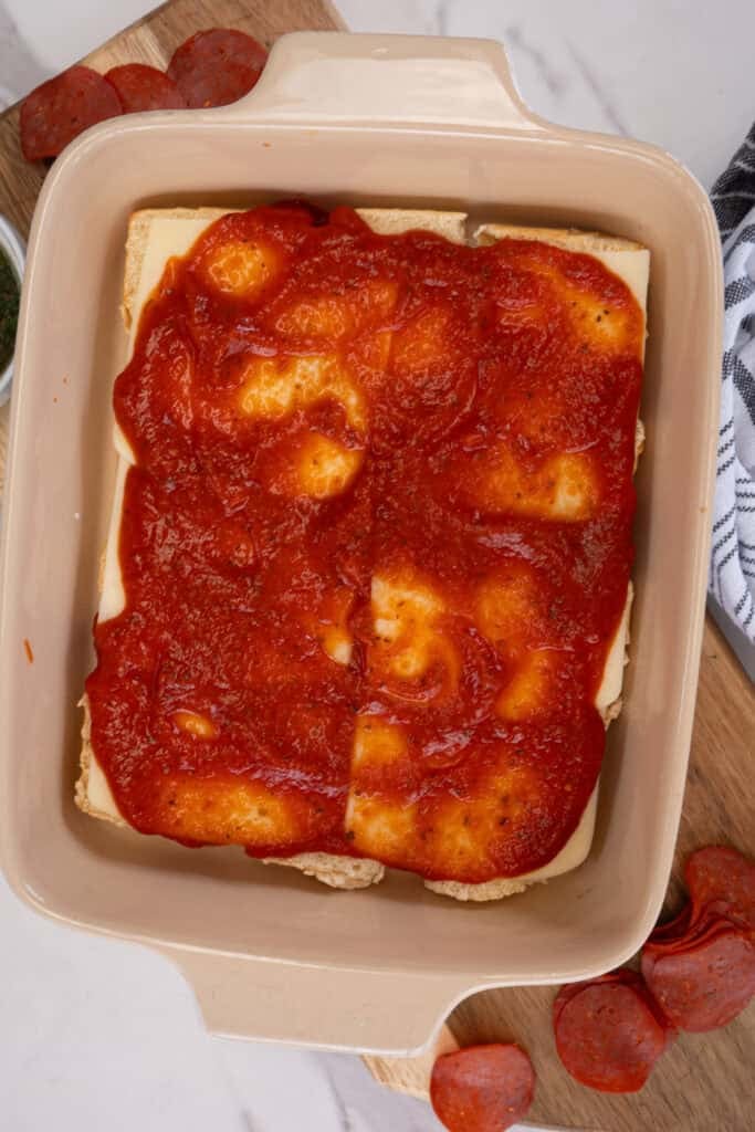 Spread a generous layer of marinara sauce over the mozzarella. This creates the saucy base that ties everything together and mimics a classic pizza.