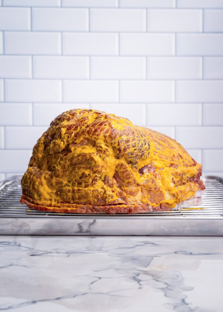 Start by using mustard as a binder to help your BBQ rub stick to the outside of the ham. Use your hands or a brush to coat the entire ham thoroughly.