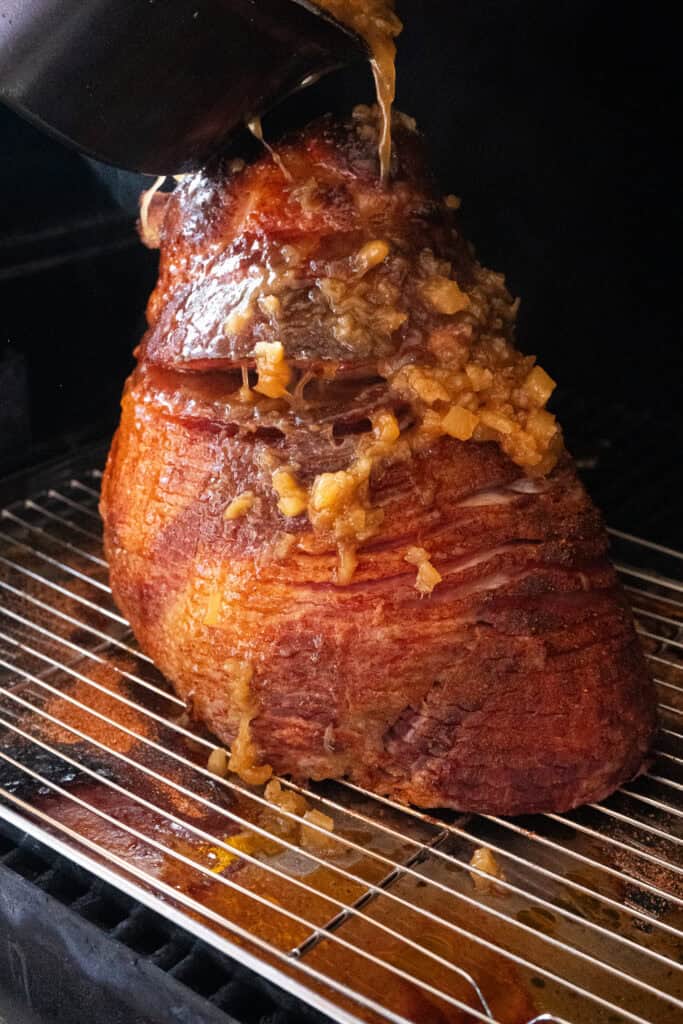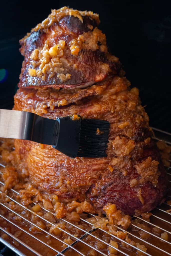 After the first 2 hours of smoking, begin brushing the glaze over the surface of the ham every 15 minutes. The sugars caramelize, giving you beautiful color and flavor.