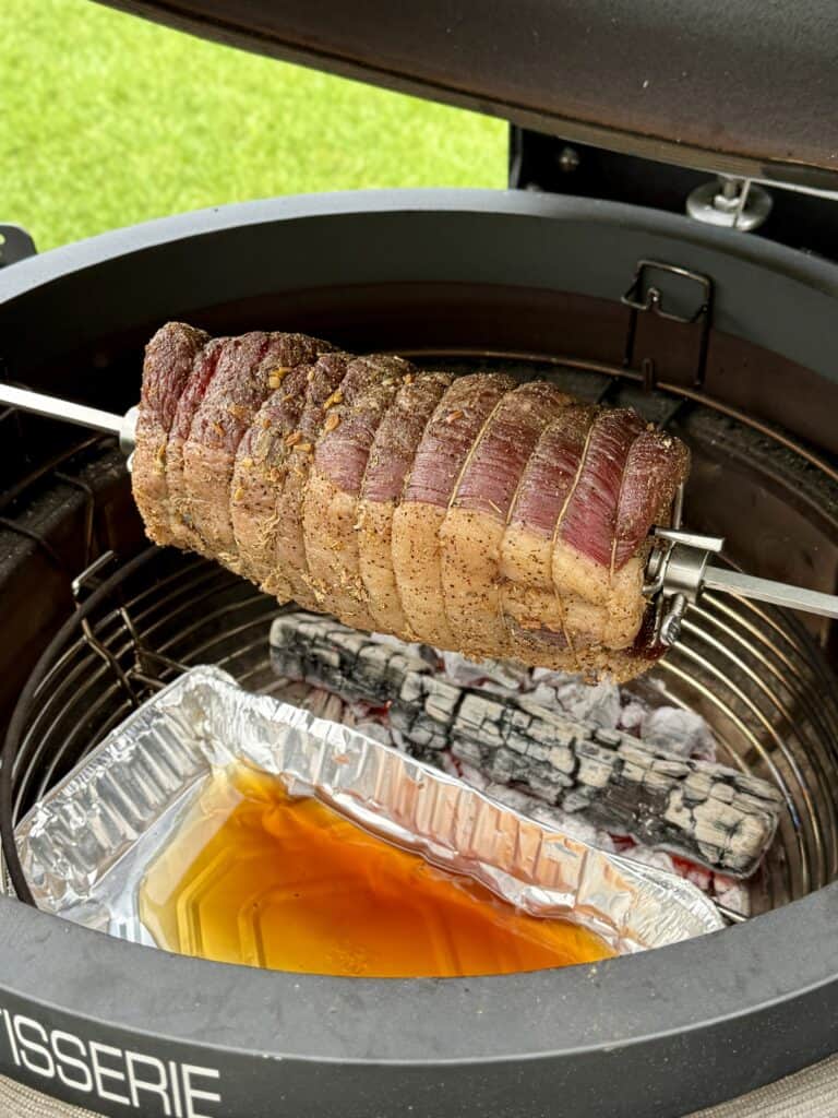 - Place the roast on the rotisserie at 275F for 1.5-2 hours with the coals banked to one side of the rotisserie. Use a foil pan underneath the roast to catch the drippings.