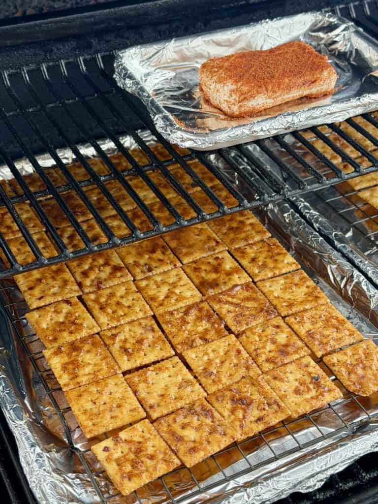 5. Smoke everything at 225°F for one hour. Once the glaze sets and the crackers look dry and golden brown, remove them from the smoker.