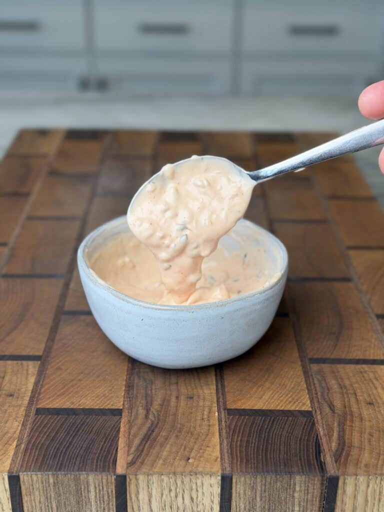 This simple dressing adds creamy sweetness and tang that balances the smoky meat and salty kraut.