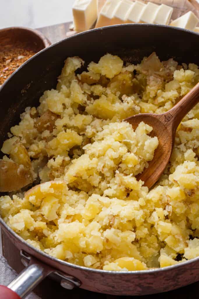 - Warm your dairy ingredients: Bringing the butter, milk, and sour cream to room temperature makes a huge difference in the texture of your mashed potatoes.