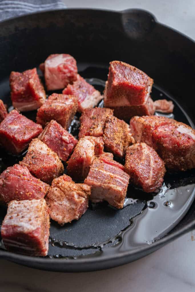 Cube the ribeye steak into bite-sized pieces. Coat with oil and season with steak seasoning, garlic powder, onion powder, kosher salt, and pepper.