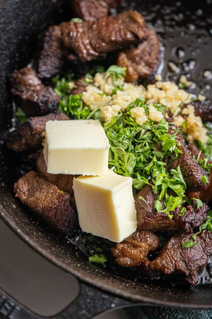 - Cook the steak bites over high heat in a skillet stirring every couple of minutes. Once browned on all sides, add 2 tbsp butter, 3 cloves minced garlic, 1 tbsp fresh thyme, 1 tbsp fresh parsley then mix until fully coated.