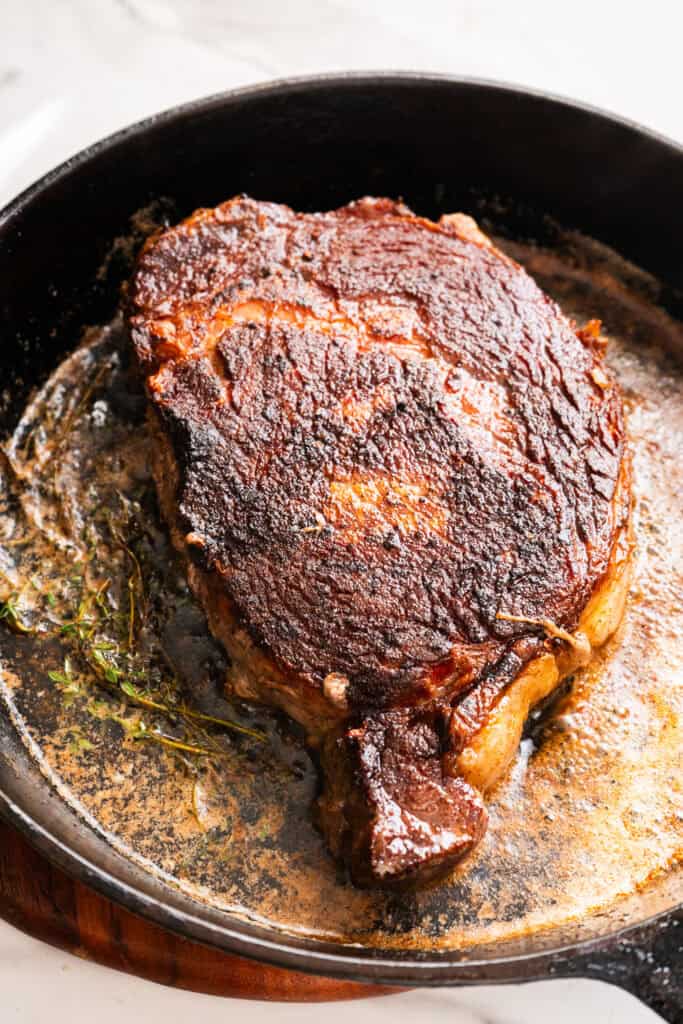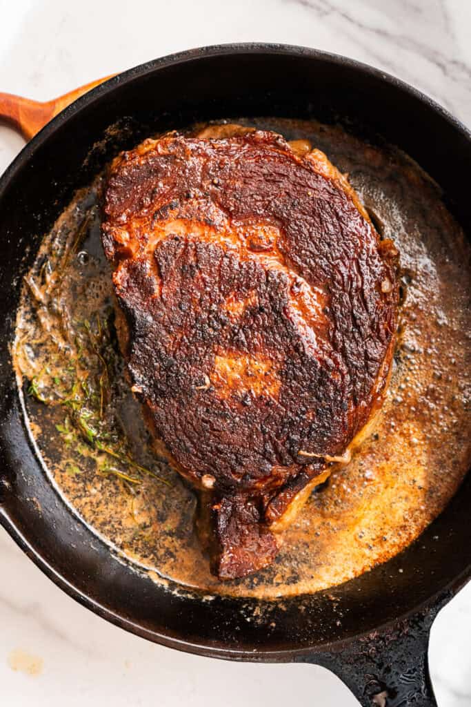 - Add 5 tbsp butter and a bunch of thyme towards the end and baste the steak in the melted butter.
