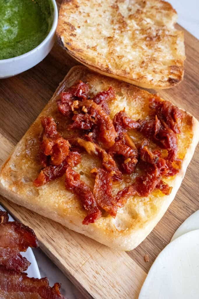- Assemble the sandwich with sun dried tomatoes on the bottom evenly spread out, Add turkey, bacon and provolone cheese.
